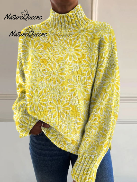 Women's Vintage Lovely Floral Art Print Knit Turtleneck Pullover Sweater