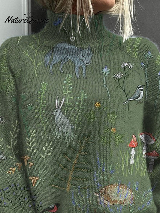 Woodland And Animal Pattern Printed Knit Turtleneck Pullover Sweater